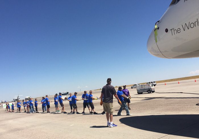 The Plane Pull was a giant tug-of-war between a team of up to 25 people and a 164,000-pound airplane. Each team was challenged to pull a jumbo jet 12 feet across the tarmac in the least amount of time.